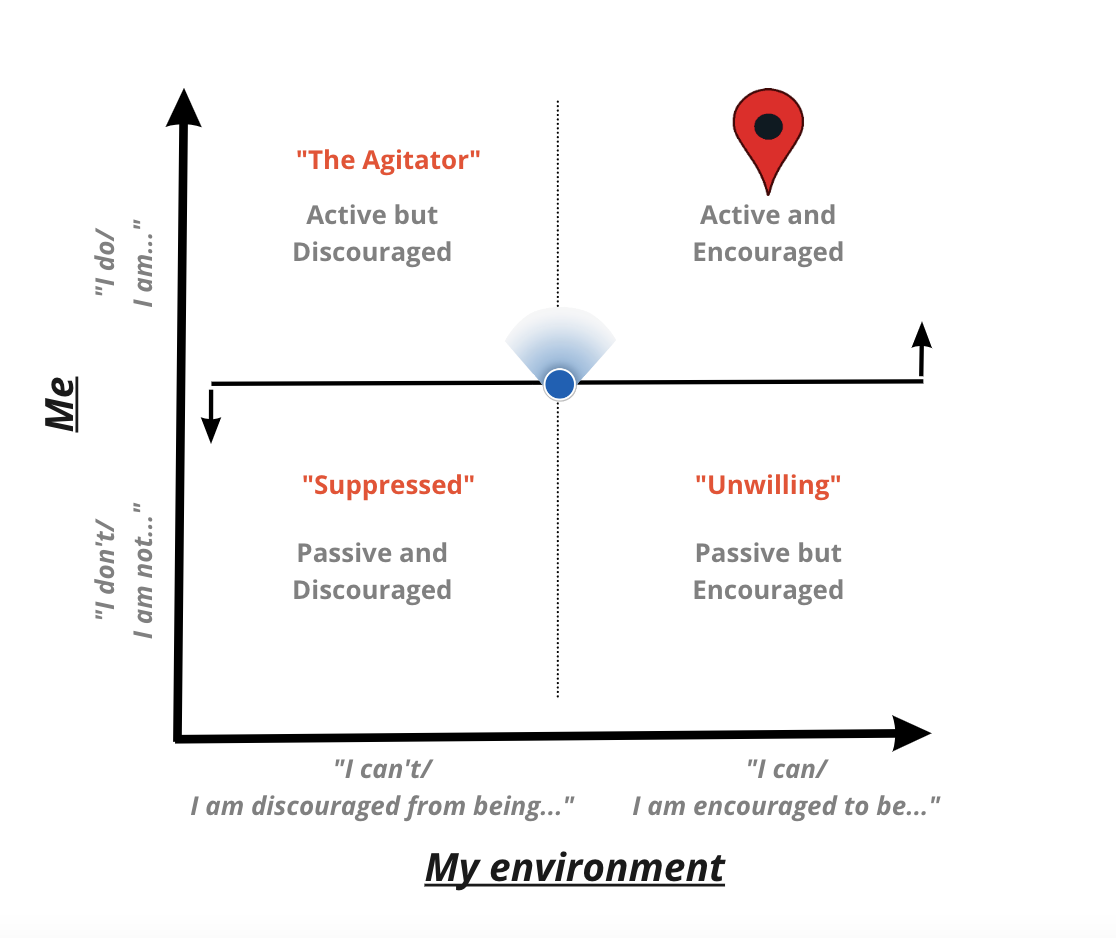 Active but Discouraged: the environment actively discourages positive behaviours, but the person is an “Agitator” looking to exhibit them and lead by example. Probably time to get out of that situation, unless something changes and your behaviours start to become adopted by others