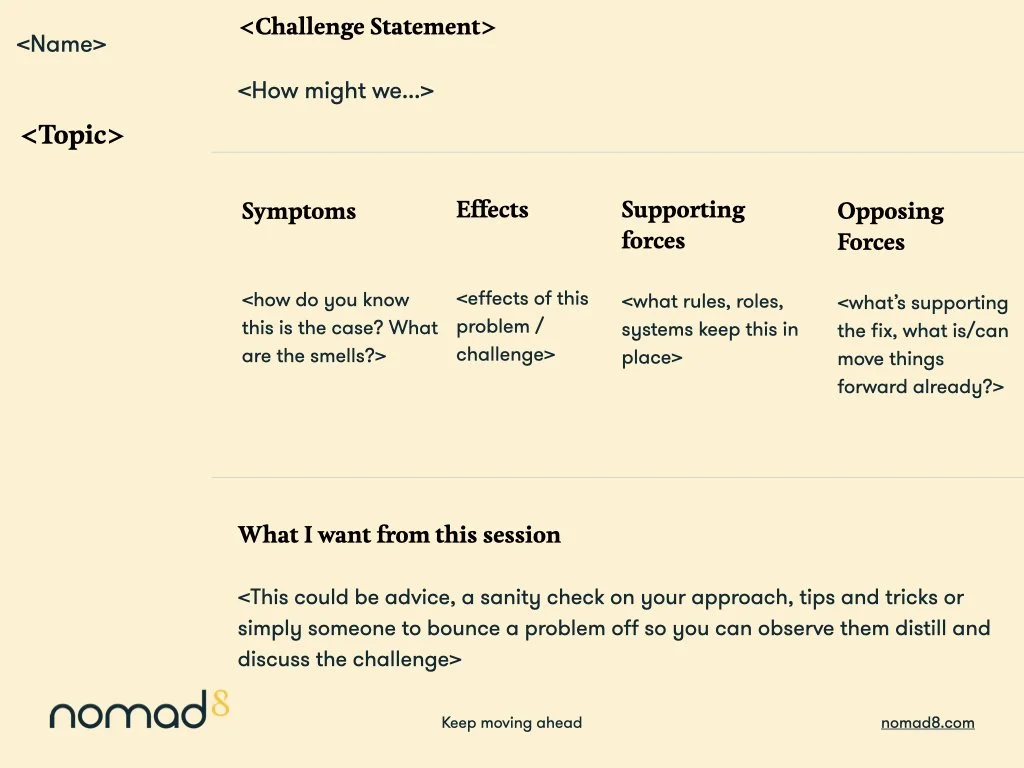 In the week leading up to the session, the Presenter (the person bringing the challenge to the group) thinks through and specifies what they want to discuss, and what they want to get out of the session.