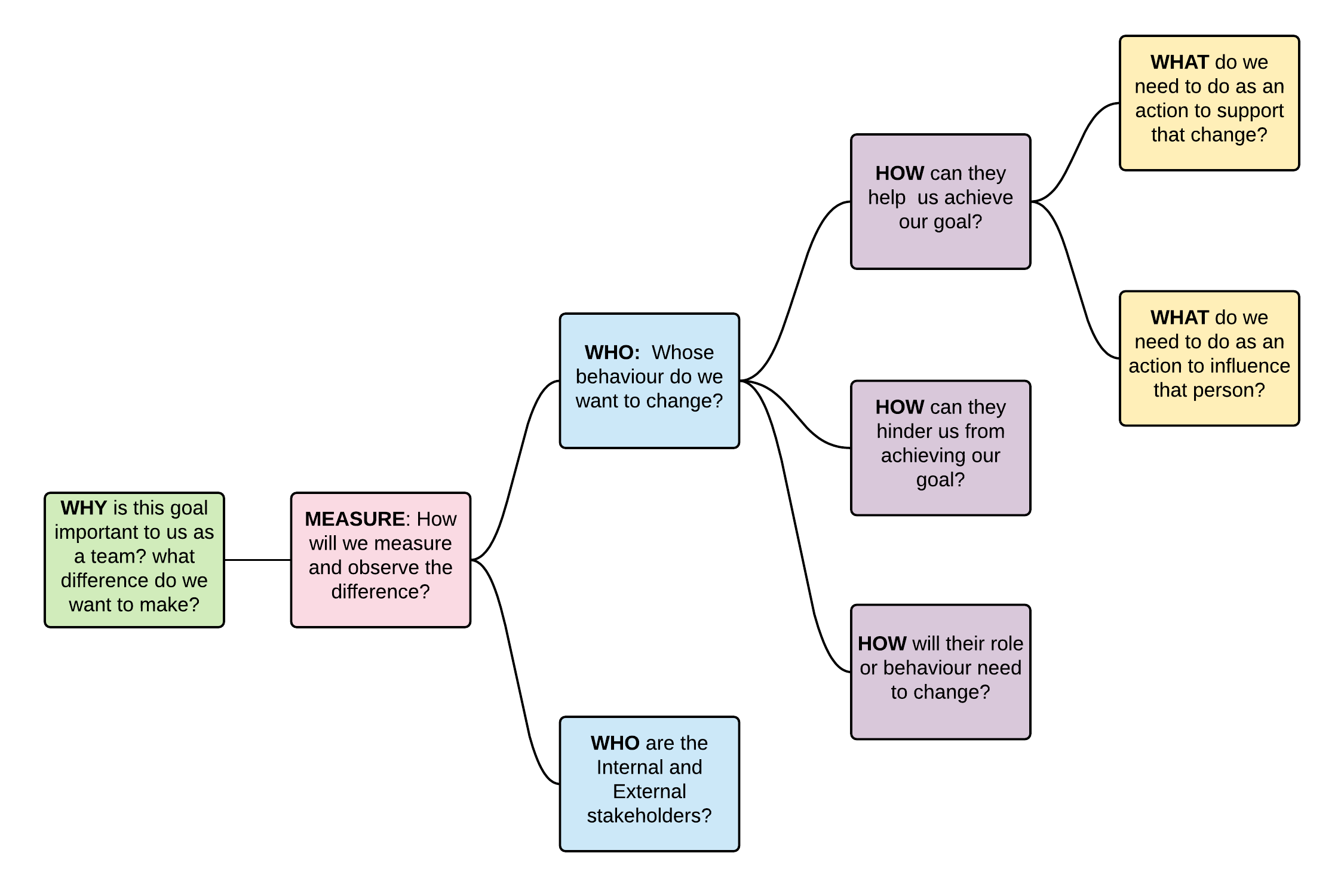 How: How can the stakeholders identified support the team in achieving their goal? Are these stakeholders likely to obstruct or hinder the team? How would the stakeholders role or behaviour need to change?