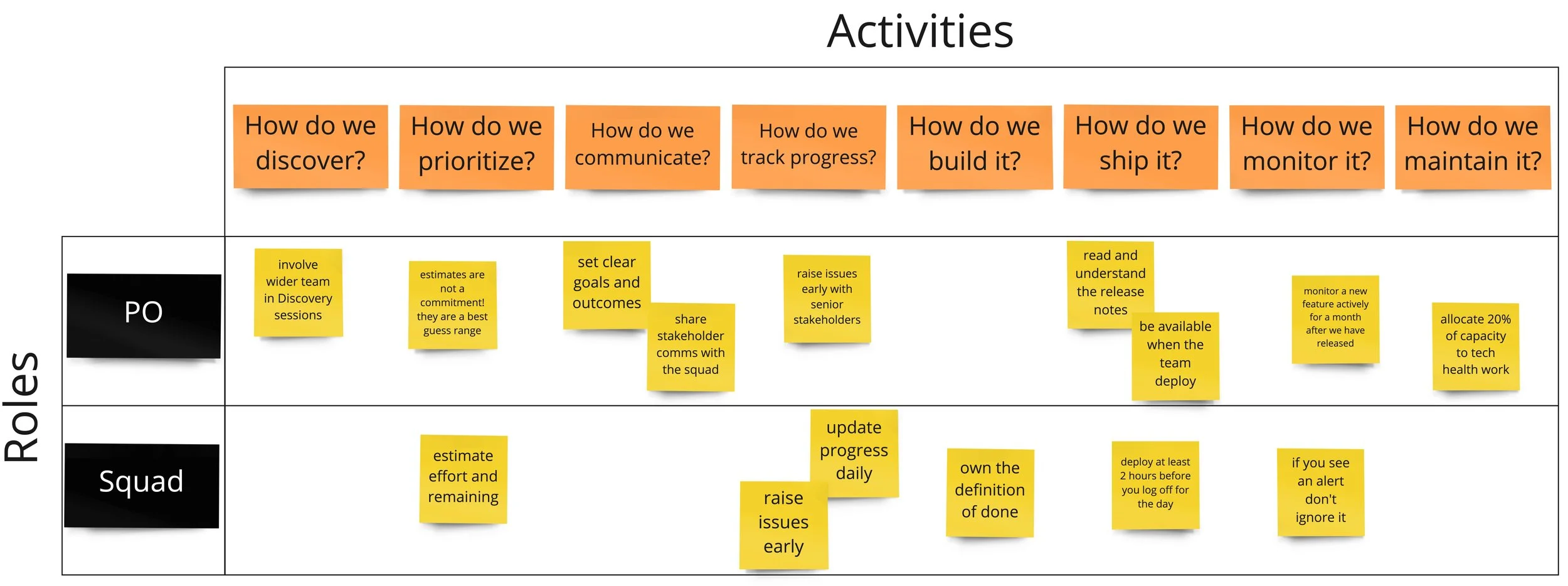 I wanted something that would give my sessions a structured framework; enter Jeff Patton’s story mapping. My thinking was if it worked so well to create tasks into a holistic view, why not role expectations? I adapted it to create an ‘Expectations mapping’ workshop and have found it provides a backbone that allows a group to create a shared view of expectations in a structured way.